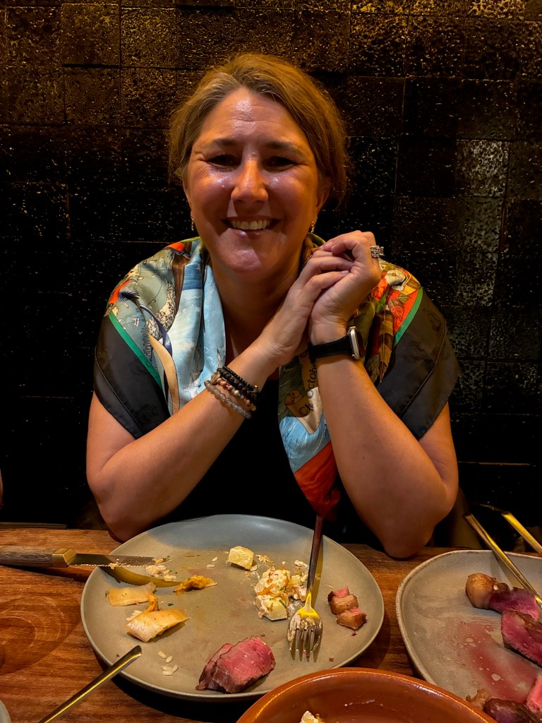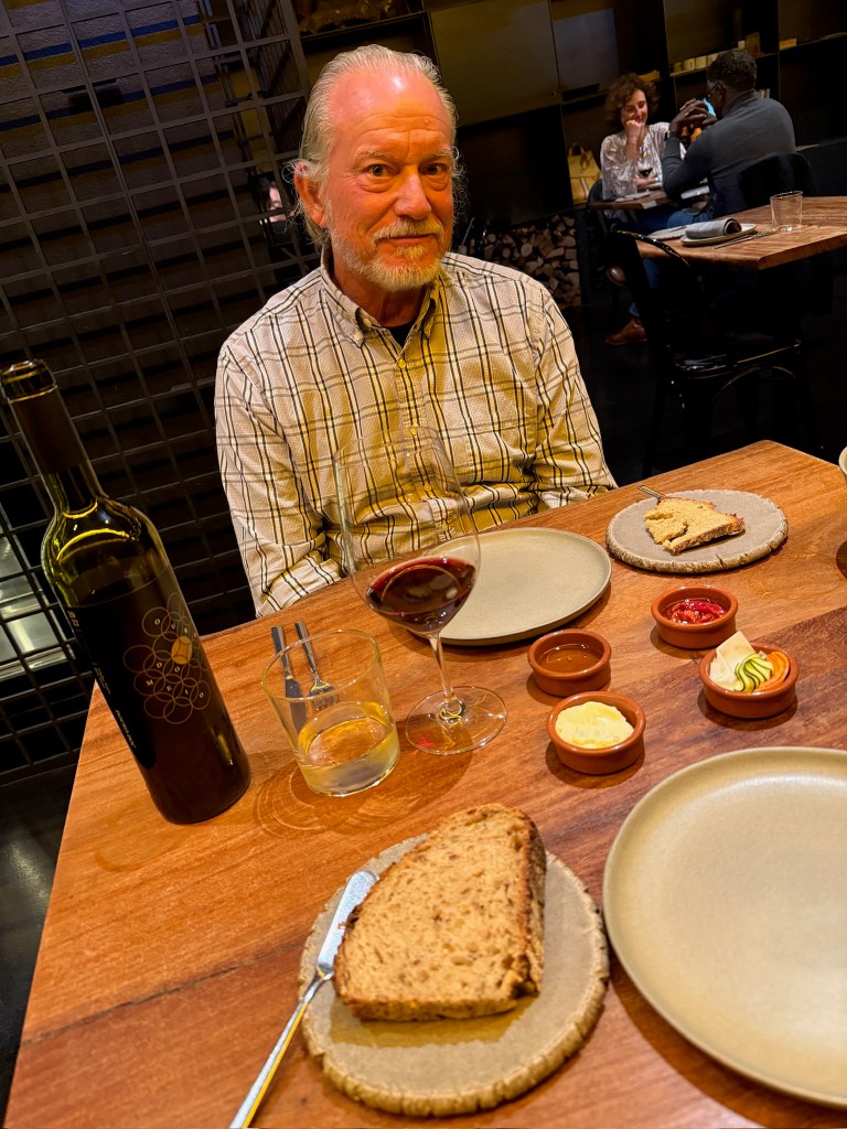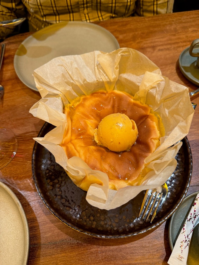 We recently flew to our apartment in Lisbon arriving on the morning of November 11th, which is our wedding anniversary. However, knowing that we would be exhausted from flying overnight and likely would not get any useful sleep, we decided to celebrate the following evening. I had booked a table at Fogo that I had read about in the Michelin Guide and it just so happens that the restaurant is only a 12-minute walk from our apartment. Fogo, which means fire in Portuguese, really exemplifies the soul of this restaurant. Many of the meat, seafood, starters and side dishes are cooked in the visible open-fired grill. Not only is the atmosphere comfortable and inviting but the aromas that the wood-fired grill produce makes your mouth water! We started with a bottle of Ouro do Meio Reserva from Portugal’s Douro Valley. While we do not consider ourselves wine connoisseurs, we do love Portuguese wine and it was especially wonderful with the food we ordered. We started with the bread service which included crusty sourdough and a very thinly sliced cornbread complimented by olive oil, butter containing pork fat, roasted red peppers and pickled carrots, horseradish and cucumbers. Honestly we could have stopped here and been 100% content. Next we enjoyed the fish tartare with amberjack, fresh dill and topped with micro-planed grapes. For our main course, we ordered the T-bone steak grilled to medium rare which came with a very tasty yet simple potato salad and some spicy kimchi. Our server also recommended their house specialty, Arroz de Forno, a traditional baked rice. Each dish was delicious on its own but the potato salad and kimchi nicely complimented the perfectly grilled steak. The rice, cooked in a cast iron pan in the wood-fired oven, was crispy on top and super creamy underneath. We thought we could not eat anything else but our server recommended his favorite dessert…the Pao de Lo Humido, a Portuguese sponge cake that has been around since the 1700’s. Ours was presented similar to a custard with gelato, olive oil and salt…a delicious treat especially paired with our espresso. Fogo, being located so close to the apartment, we look forward to trying some of the other menu options including the tasting menu.