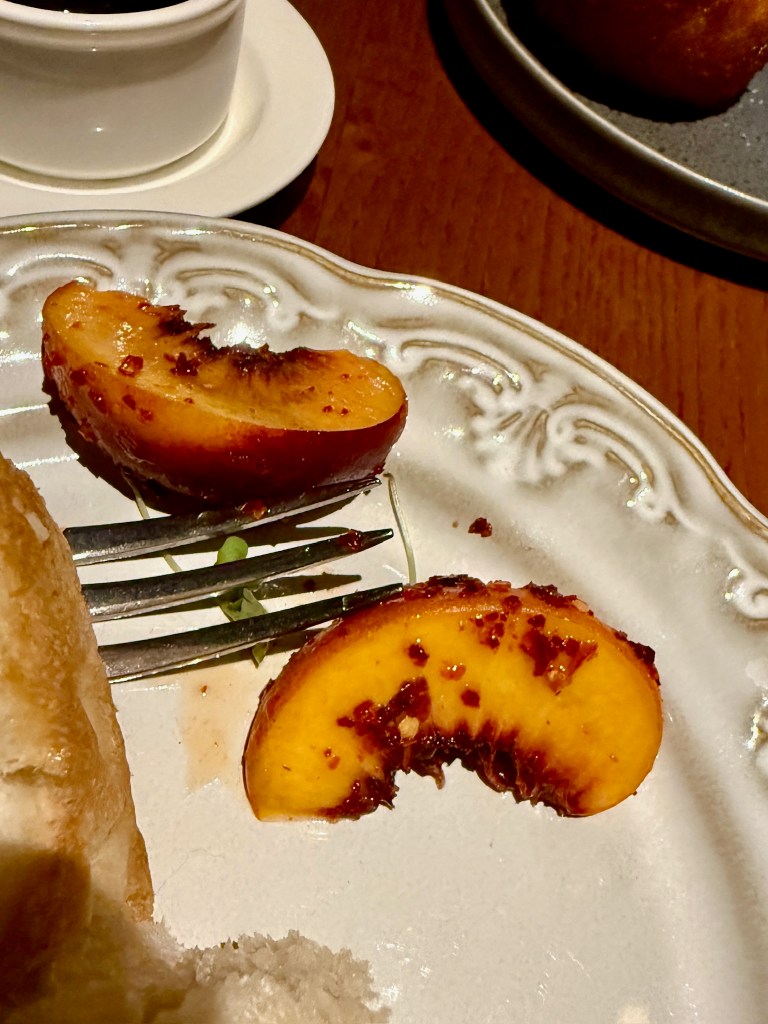 September 2025 Run don’t walk to Saint Bibiana! It’s that good. Tucked inside a historic mansion associated with the new Hotel Bardo, this beautiful restaurant serves modern Italian cuisine that is some of the best we have tasted recently. Located on Drayton Street next to Savannah’s famous Forsyth Park, the restaurant has an inspired menu including house-made pasta, an extensive wine list, and the service was over the top. While everyone that we met was super helpful and happy to be working there, our server Kristen was very energetic, knowledgeable and generous. Our evening started with cocktails; a barrel-aged Negroni for my wife and a rye manhattan for me. Both were on-point, but the Negroni was very interesting in that Kristen showed us a special memo book that contained what ingredients were added to the barrel, when they were added and who added them. Next we had our Antipasta; Arancini Alla Siciliana and the Summer Fruit which was 500-day prosciutto with grilled fresh peaches and hot honey.