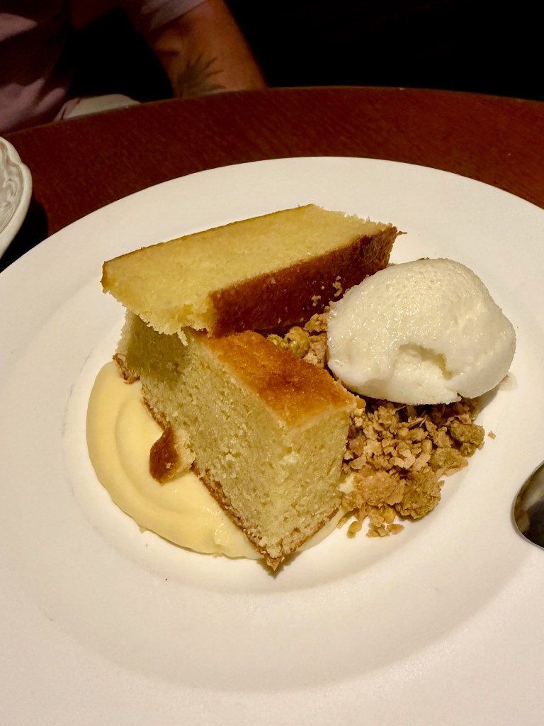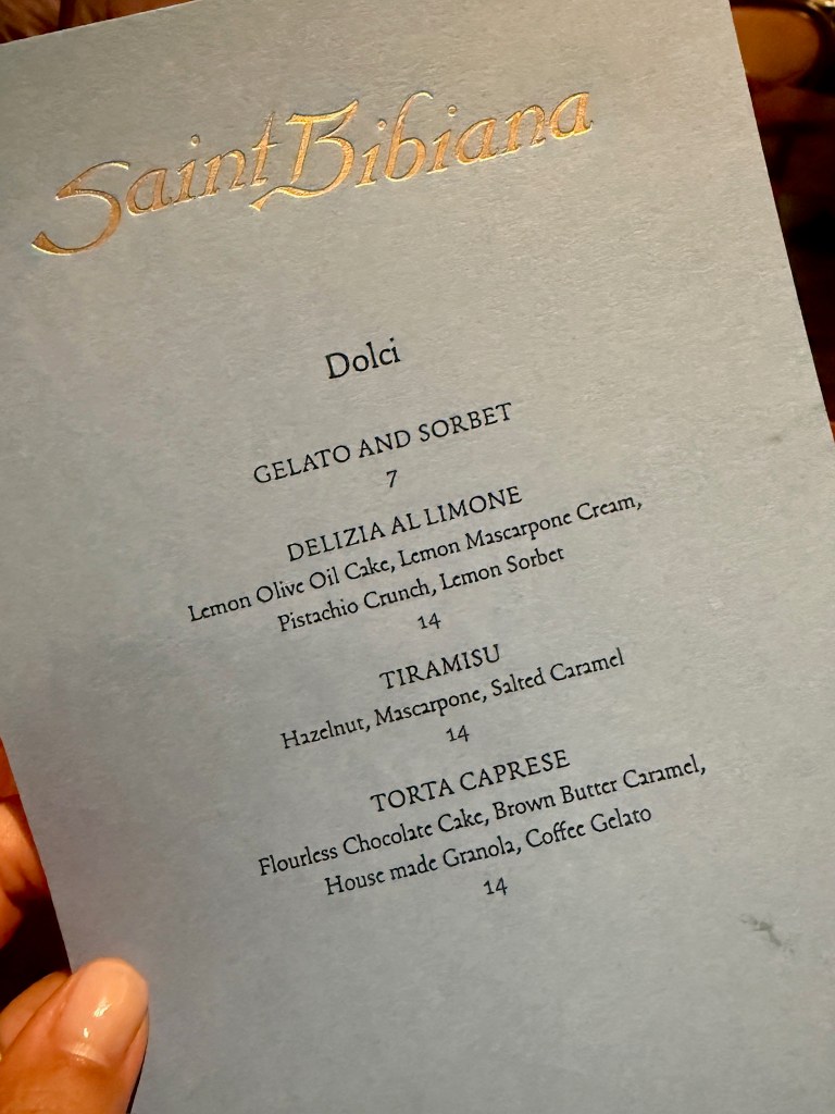 The arancini was nicely spiced with tomato-braised pork and risotto and the prosciutto melted in your mouth. While I’m not a peach lover, these were firm and sweet and combined with the hot honey, I ate all of them on my plate. Next was a very fresh salad containing radicchio, sugar peas, and pea shoots in a pecorino Romano vinaigrette that was so delicious. Our pasta selections that we shared were the Ravioli Margarite and the Cavatelli Sardi. The ravioli was topped with a mint pesto that worked nicely with the pecorino cheese and the cavatelli had just the right amount of spicy heat that we both enjoyed. Hold on though…the best dish was one we didn’t even order. Kristen brought us the Polenta Romano topped with a duck egg and insisted we couldn’t leave here without tasting this and she was so right. We ate all of it! Our wonderful evening at Saint Bibiana ended with espresso and sharing the Delizia Al Limone, a lemon olive oil cake. Fortunately, we only had to walk a few steps back to our hotel room at the Bardo. We will return soon for another fabulous meal at Saint Bibiana in our favorite southern City!